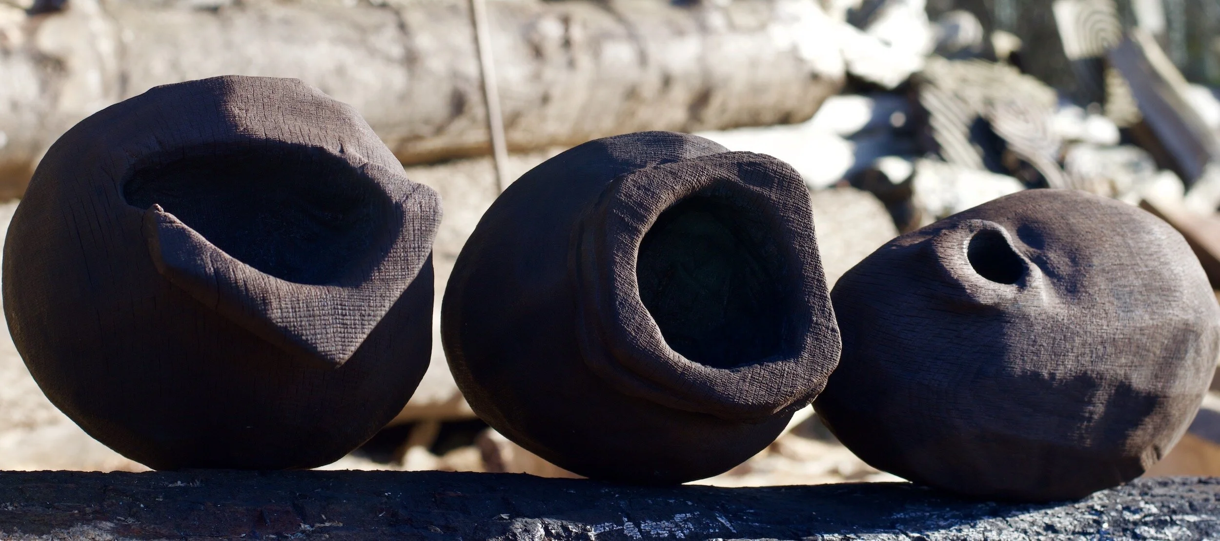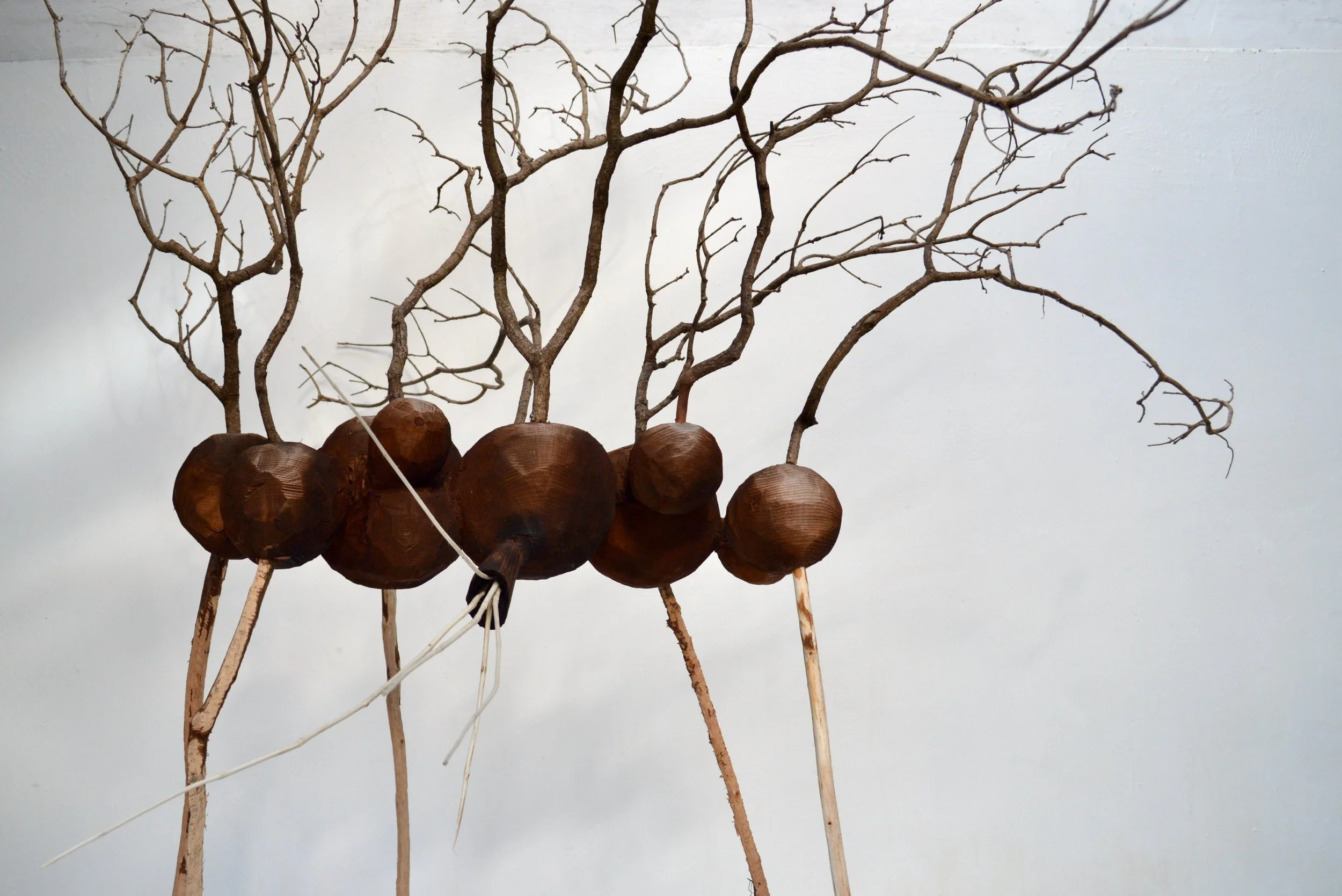 “My work is a celebration of the collective intelligence of the living world. After a childhood overshadowed by violence, I made a choice to explore interconnection and tenderness as a counter to dissociative trauma narratives. Whilst acknowledging the violence of ecocide on human and nonhuman communities, I have worked to create forms redolent of hope and a gratitude for life, creating a personal archeology of artefacts celebrating interspecies survival as a path towards a broken belonging. I have sought to honour the local as a foundation for homecoming and an opportunity to turn towards tender care of life’s diversity. Having worked in woodland as my studio over many years, my relationship with living cycles and systems has continually informed my work and I have found joy in deepening my relationship with wood as my primary material. From roots to leaf tips the forest whispers and forms emerge, shaping memories of ancestral cross species relationships as old as life itself, the underlying chatter even older and more deeply embedded into the foundation of matter. Whilst overwhelming global destruction threatens to overshadow life’s fleeting connective joys, creativity has the power to form new structures and attitudes. In making soil-to-soil sculptures in connection with the land, I hope to invite the viewer to exist fully in the moment with the work and the land, and within that temporary space to dream of the blooming of a more resilient regenerative culture. ”